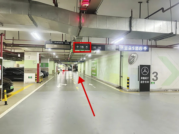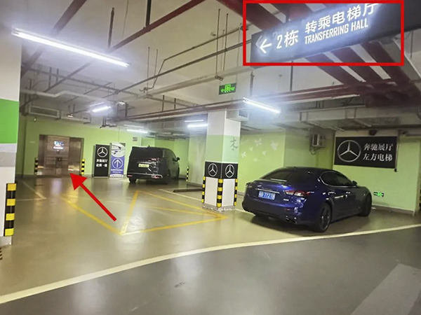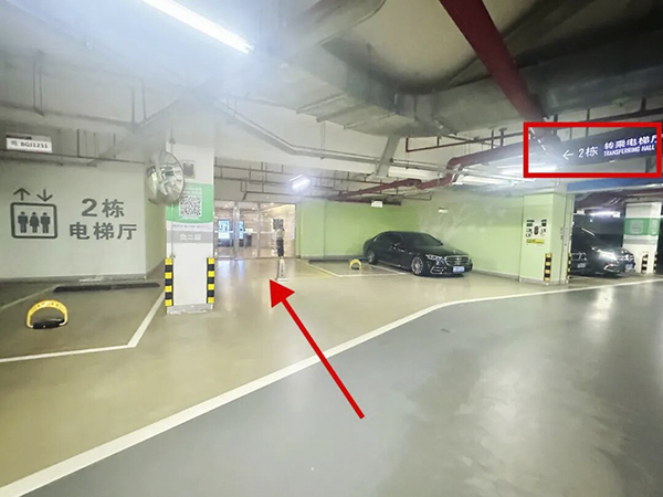 安全停车后按照路面指引找到通往2栋的转乘电梯,搭乘电梯至1楼出电梯直走往左拐后看到大堂,换乘高层搭电梯上22楼